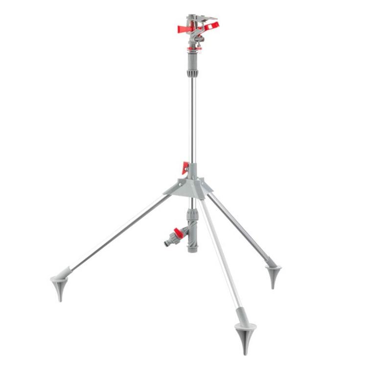 Дождеватель легко переносить с места на место и стационарно устанавливать на необходимом участке. Ножки имеют специальные клинья для надежной фиксации в земле. Массивная тренога-штатив обеспечивает полную устойчивость конструкции в мягкой земле, на сильном ветру и пр.