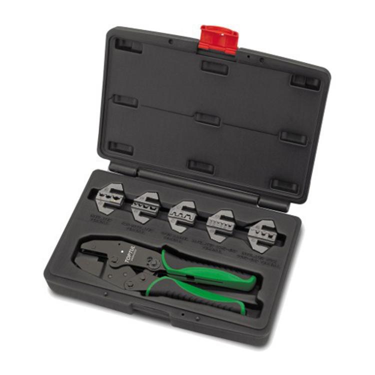 Набор для обжимки клемм универсальный TOPTUL GAAI0605.Особености:Скребковый механизм обеспечивает превосходную трудоемкость;Быстрая замена насадки, без применения какого-либо инструмента;Профессиональные шлифовальные обжимки соблюдены по всем AISI 4140;Эргономичная ручка для комфортного захвата.