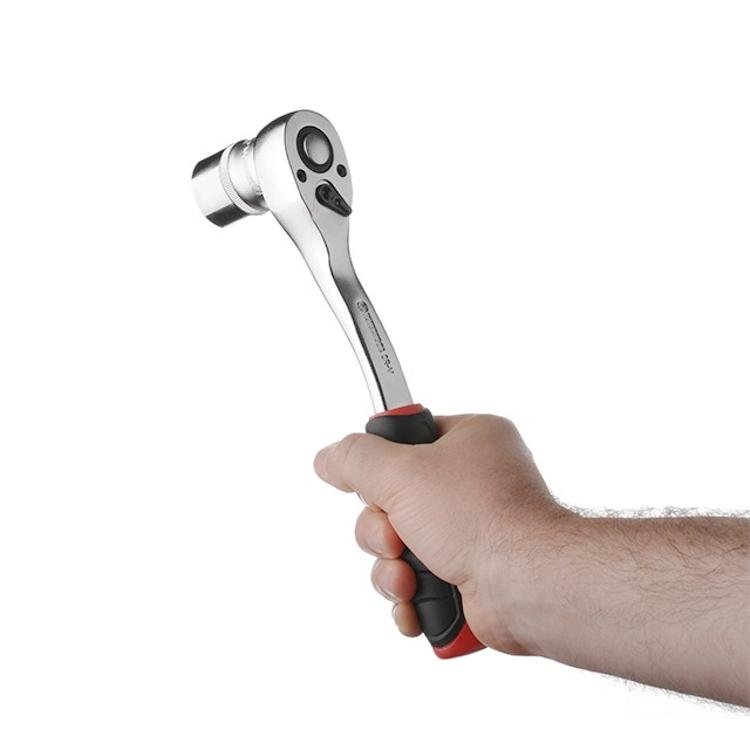 В основу набора входит трещотка 1/2"с прорезиненной ручкой и изогнутой формой рукоятки для комфортной работы в труднодоступных местах. Механизм трещотки на 72 зуба тайваньского производства, делает ход трещотки плавным и позволяет работать в ограниченном пространстве.