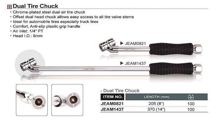 Насадка для подкачки колес хромированная JEAM1437 TOPTUL. Смещенный патрон головки обеспечивает доступ ко всем типам автомобильных вентилей, специализирован для работы с шинами грузовых автомобилей. Оснащен удобной, противоскользящей ручкой.