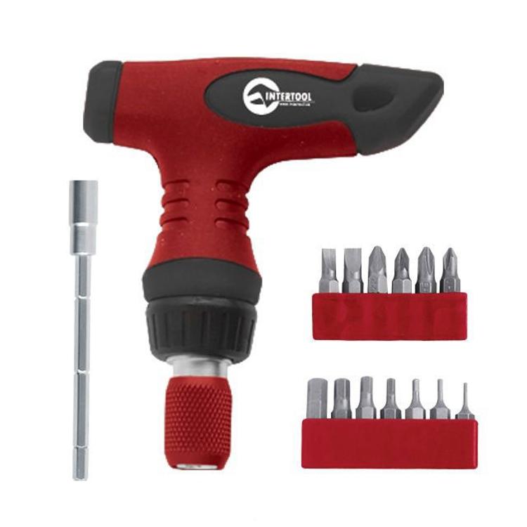 Отвертка Т-образная реверсивная с цанговым зажимом мини, комплектом насадок 15 ед. INTERTOOL VT-1016