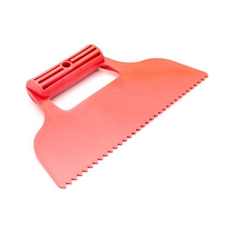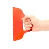 Зубчатый шпатель применяется для нанесения клея, такой шпатель особенно востребован при укладке плитки, по форме схож с фасадным, но имеет зубья для распределения и разравнивания раствора. Оснащен удобной рифленой рукояткой.