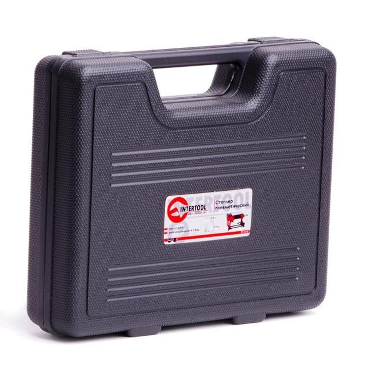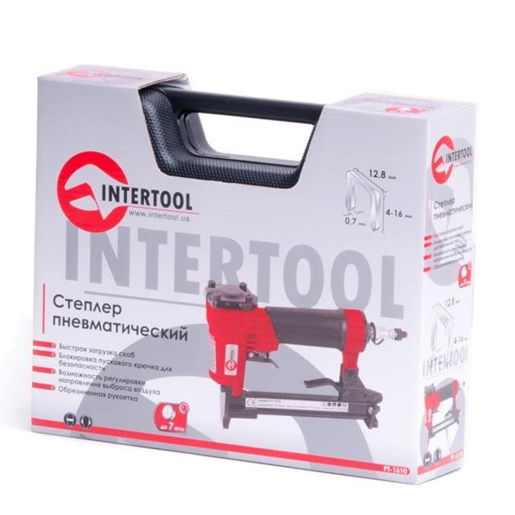 INTERTOOL PT-1610 — пневматический степлер под скобу, широко применяемый в мебельной промышленности и строительно-ремонтных работах. Одним из главных его достоинств является наличие механизма быстрой загрузки скоб, что существенно повышает скорость и эффективность работы. Высотаскоб, с которыми может работать степлер от 6 до 16 мм, ширина — 12,8 мм и сечение — 0,7 мм. Пневмостеплер РТ-1610 имеет эргономичный дизайн и обрезиненную рукоятку, что существенно повышает комфорт работы с данным инструментом.