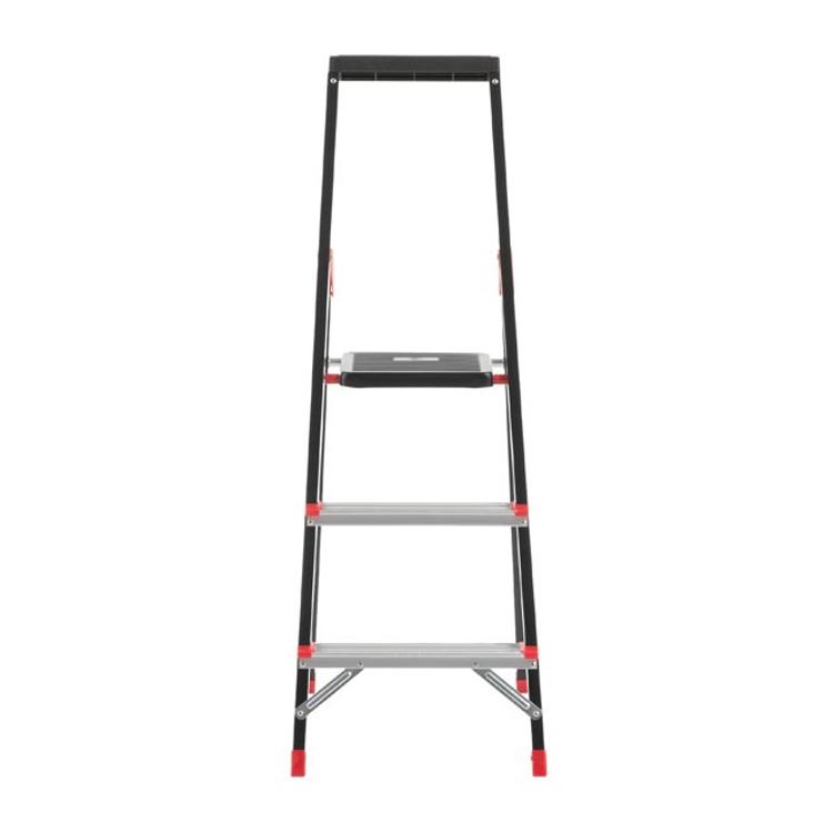 Стремянка изготовлена из прочного стального профиля с алюминиевыми ступенями. Рифленые ступени не позволят скользить ноге и обеспечивают безопасный подъем, а также удобное положение во время работы. Стремянка соответствуют европейскому стандарту EN131 и выдерживает нагрузку до 150 кг.