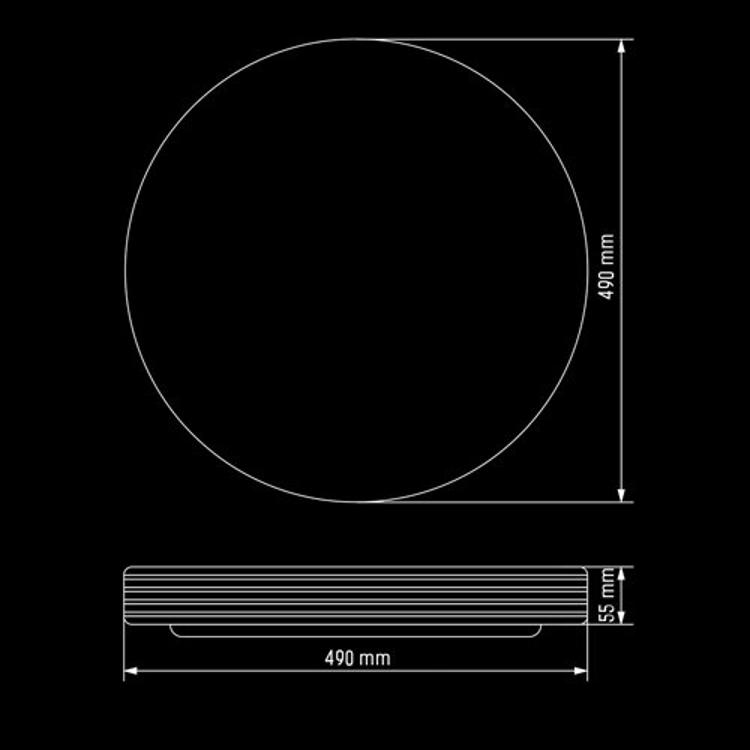 Матеріал плафона – полікарбонат, а арматури – метал. Діаметр світильника дорівнює 50 см, товщина – 6 см. Діапазон напруг живлення від 175 до 265 В. Оціночний термін експлуатації – не менше 40 тисяч годин. Клас захисту – IP20.