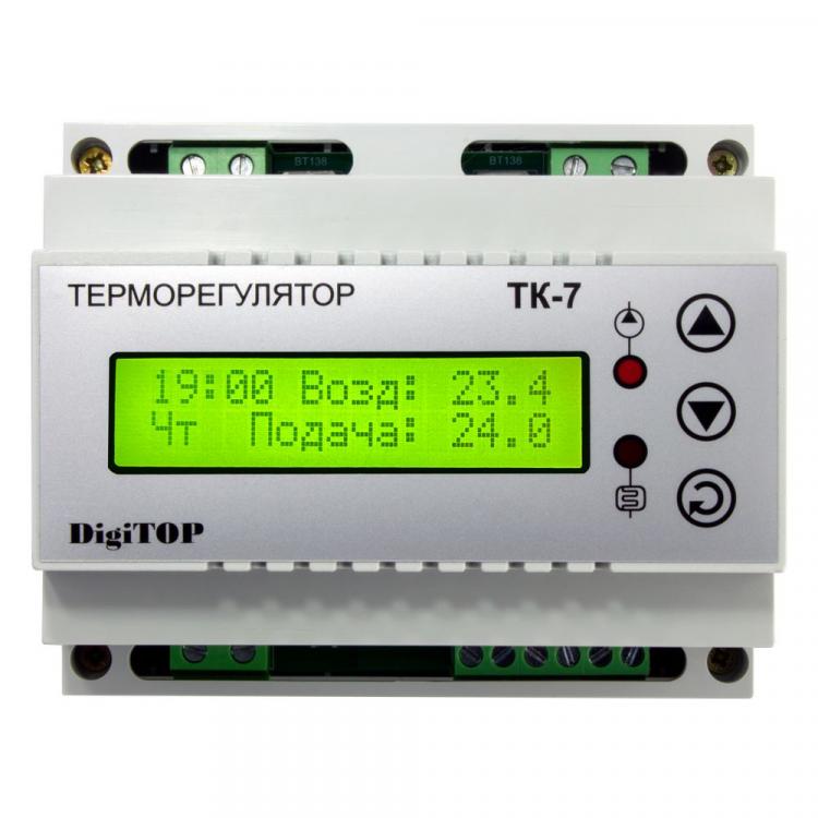 Терморегулятор (Регулятор температуры) ТК-7 предназначен для контроля и поддержания температуры в жилых и производственных помещениях путем управления электрическими системами отопления (с использованием ТЭНовых, электродных котлов и пр.) с контролем температуры ПОДАЧИ, ОБРАТКИ теплоносителя, ТЕМПЕРАТУРЫ ВОЗДУХА в отапливаемом помещении и возможностью управления режимом работы насоса в отопительной системе.Терморегулятор имеет недельный программатор, что дает возможность пользователю задать конкретную температуру в определенное время суток для каждого дня недели, учитывая особенности работы в рабочие/выходные дни, в дневное/ночное время или по другим критериям.