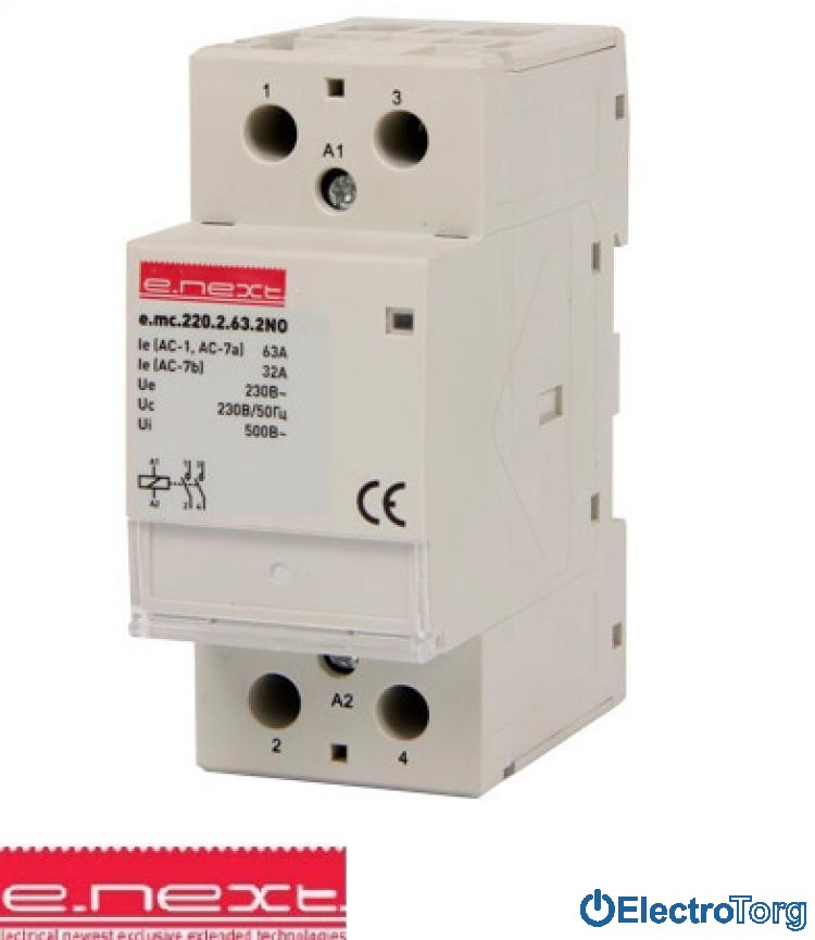 Модульный контактор e.mc.220.2.63.2NO, 2р, 63А, 2NO, 220 В E.NEXT(Енекст)