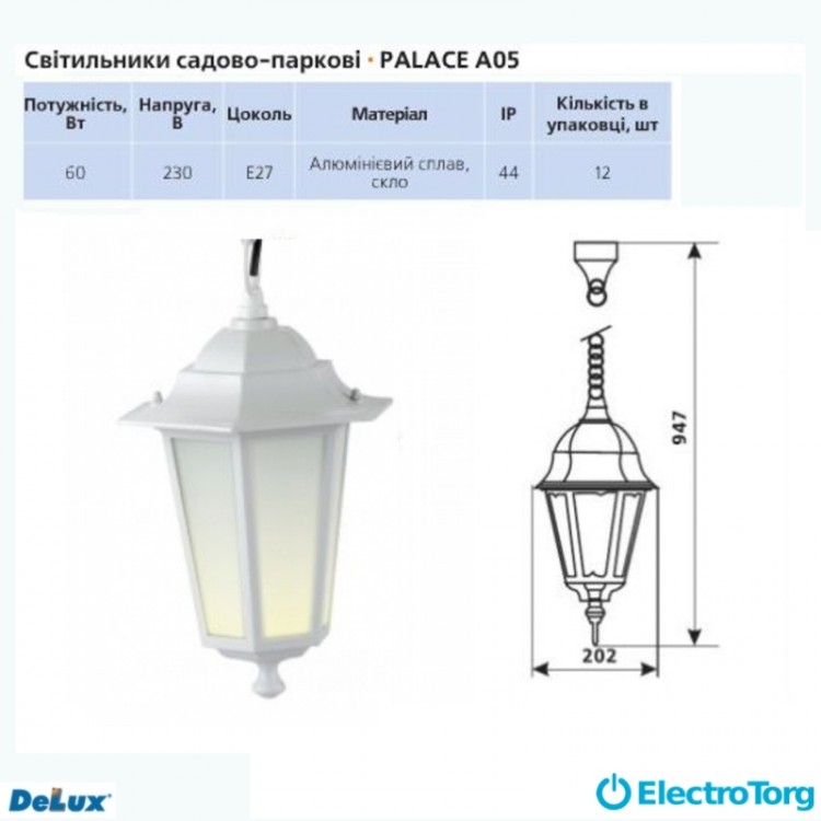 Садово-парковый светильник (белый) PALACE A05 60В Е27 DELUX, выполнен из качественных материалов, алюминиевого сплава и закаленного стекла. Переназначен для освещения приусадебных участков, беседок, крылечек. Благодаря подвесному креплению, на крюк прекрасно подойдет для монтажа на кронштейнах, для закрепления на балках и навесных конструкциях палаточного типа. Современные возможности осветительной индустрии позволяют нам подбирать удобные и интересные электроосветительные приборы как для внутреннего применения, так и внешнего. Мы можем сами создавать неповторимые решения при помощи световых иллюминаций. В нашем магазине представлен большой ассортимент светильников от компании Делюкс, они уже много лет на рынке нашей страны и потребители по достоинству оценили их товары. Мы осуществляем доставку по всей территории Украины в короткие сроки.
