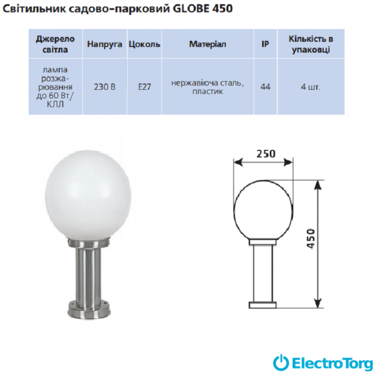 Главная особенность этого продукта – шарообразный плафон, который элегантно впишется в ландшафтный дизайн вашего парка, дачного участка, прилегающей к дому территории. Плафон изготовлен из высококачественного пластика, а арматура – из нержавеющей стали, что гарантирует светильнику долгий срок службы и устойчивость к неблагоприятным погодным условиям. Прибор достаточно компактен: его высота составляет 450 мм, а ширина – 250 мм, поэтому он не будет занимать много места. Для использования с этим светильником подойдёт энергосберегающая, светодиодная или лампа накаливания мощностью в 60Вт.
